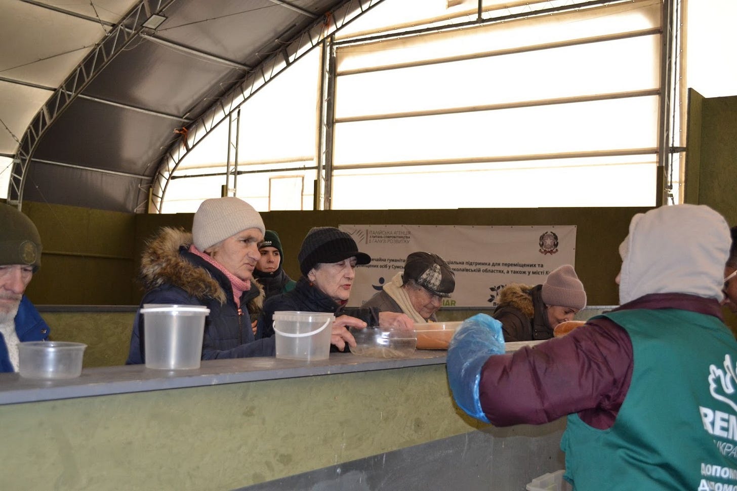 Today mashed potatoes, chicken nuggets, and salad are on the menu. After a prayer over the meal, people line up for food, served by Spanish and Peruvian volunteers who came to Ukraine to help.