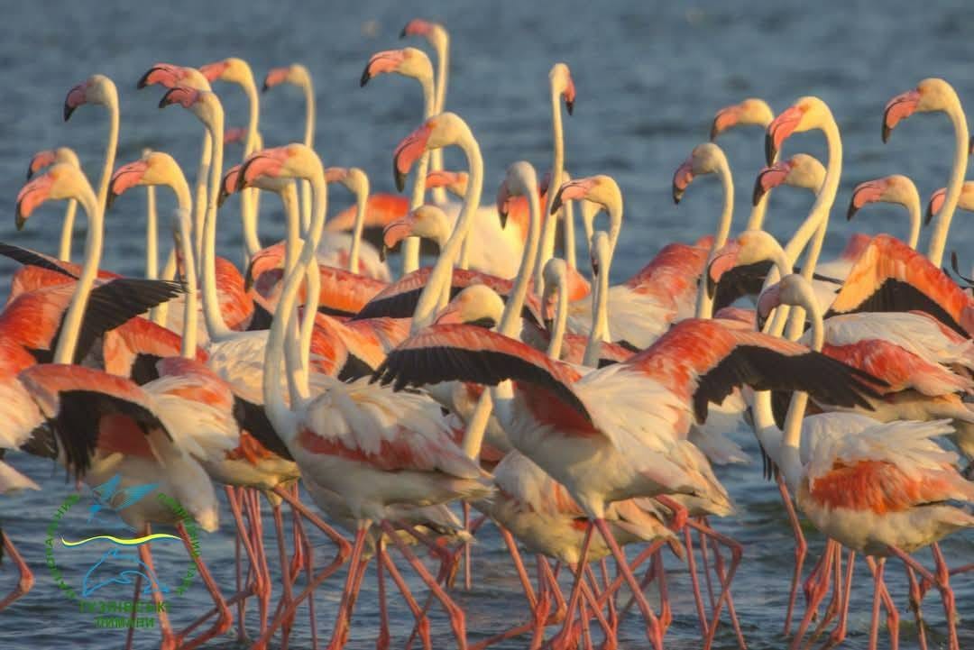 On a bright summer day, a narrow strip of land stretches between two estuaries, home to thousands of pink flamingos.