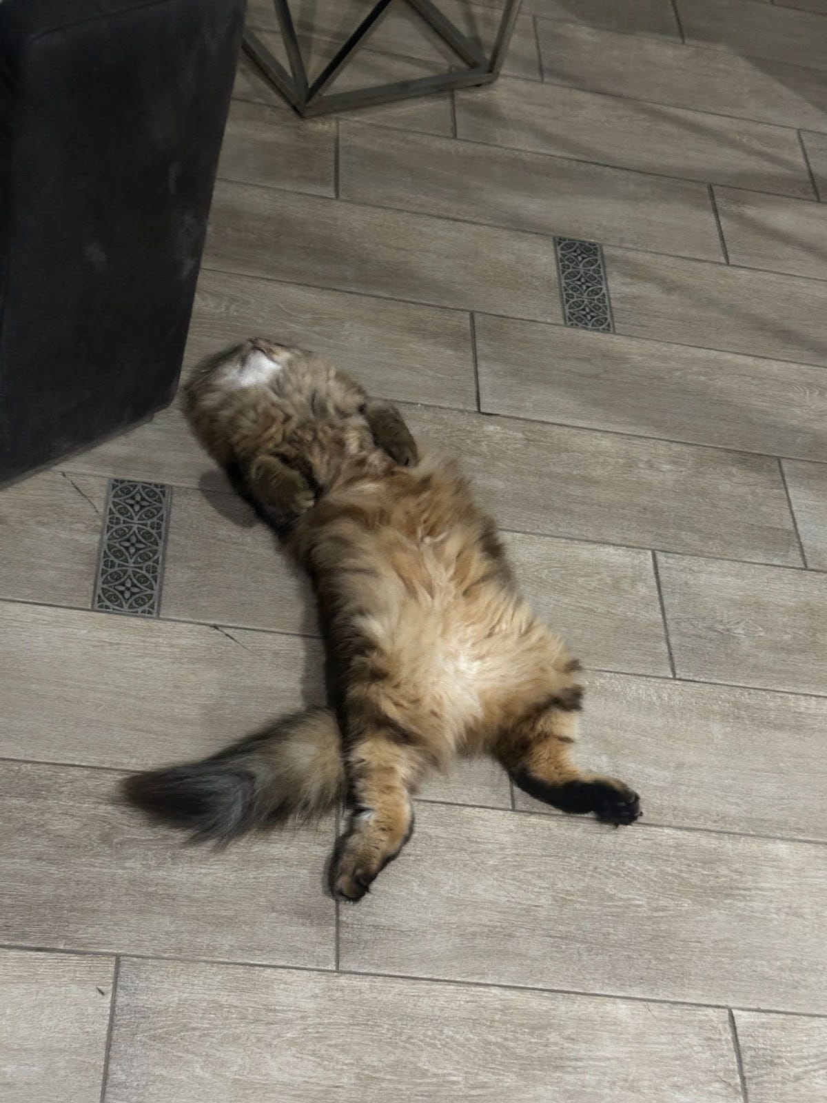 Mariana’s cat, Simba, casually sleeps on the floor, as if he works night shifts to feed his 3 children (he is just too relaxed).