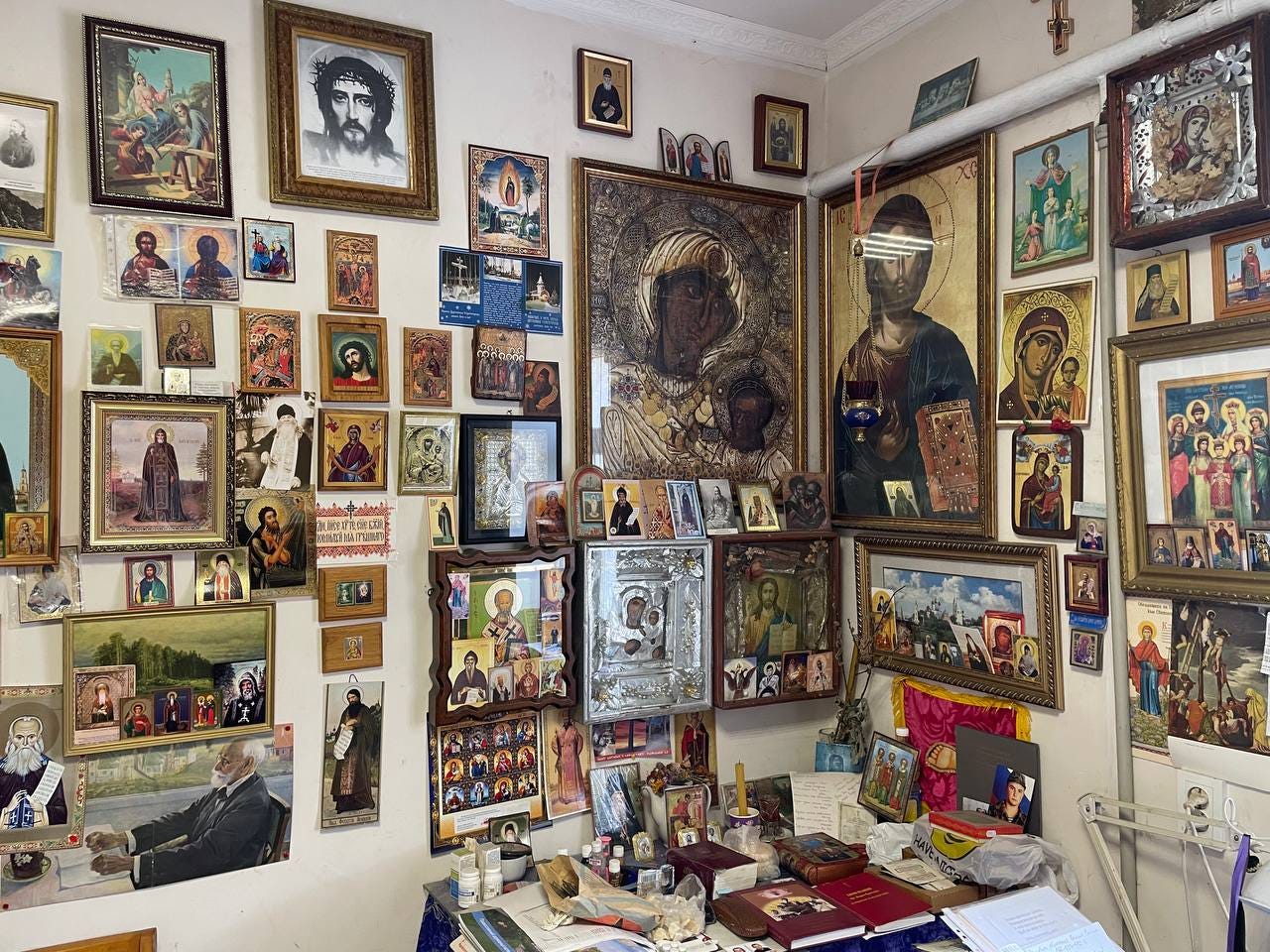 Mykola invited us to his "chapel." That is what he calls the room where he prays. Two of its walls are completely covered with religious icons.