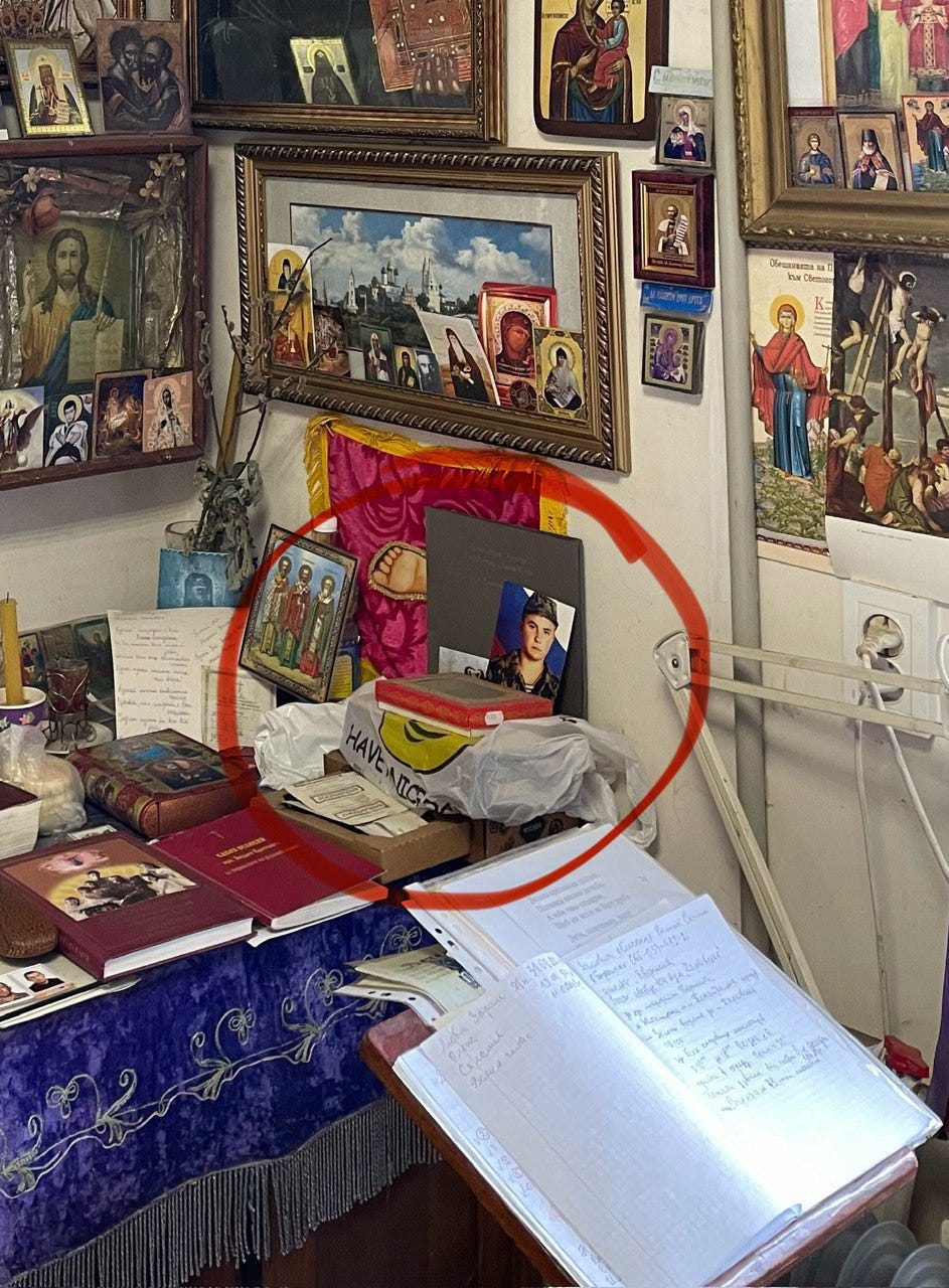 And there we see an interesting photo: a man in military uniform in front of a Russian flag. The ‘monk’ explains that this is a Russian whose head was cut off by Chechens in 1996.