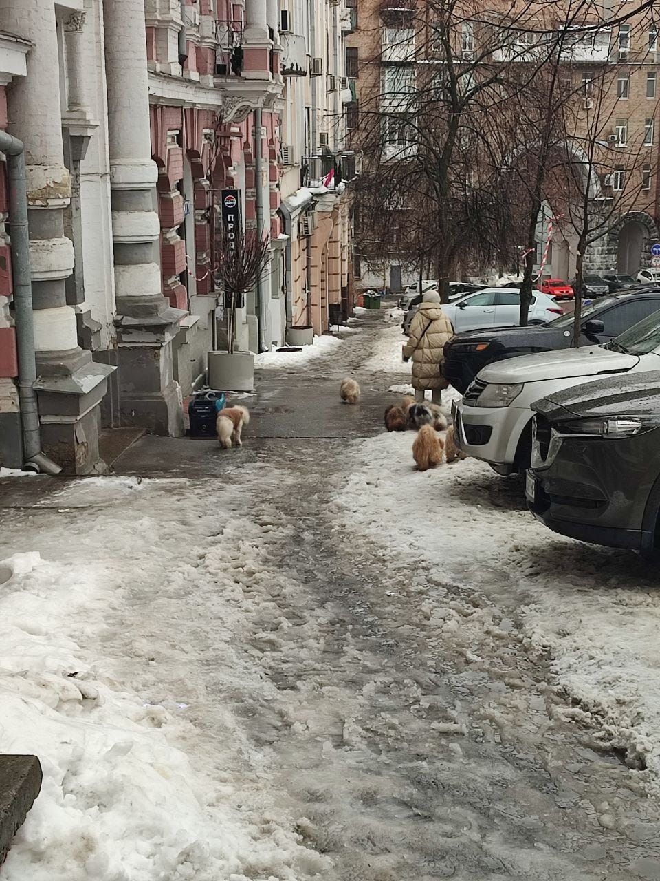 This pack of dogs often appears on Khreshchatyk and attracts people’s attention. One of the pups, Mitya, often lags behind the others, and the owner has to make sure he doesn’t fall behind.