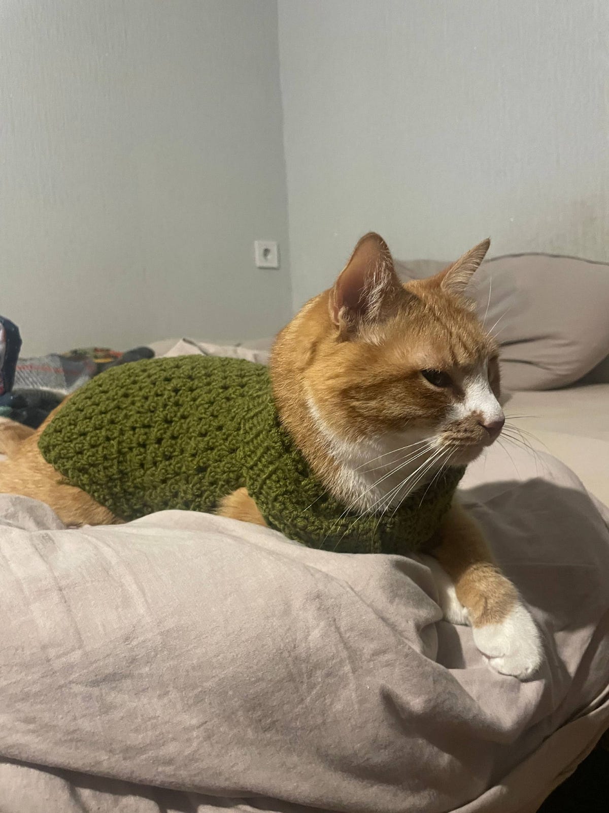 I have an orange boy cat too, but I have not had the courage to put a sweater on him!